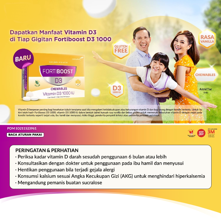 Fortiboost tablet kunyah Vitamin D3 1000 IU rasa vanilla yang dapat membantu penyerapan kalsium dan fosfor untuk kesehatan tulang dan menjaga daya tahan tubuh.
